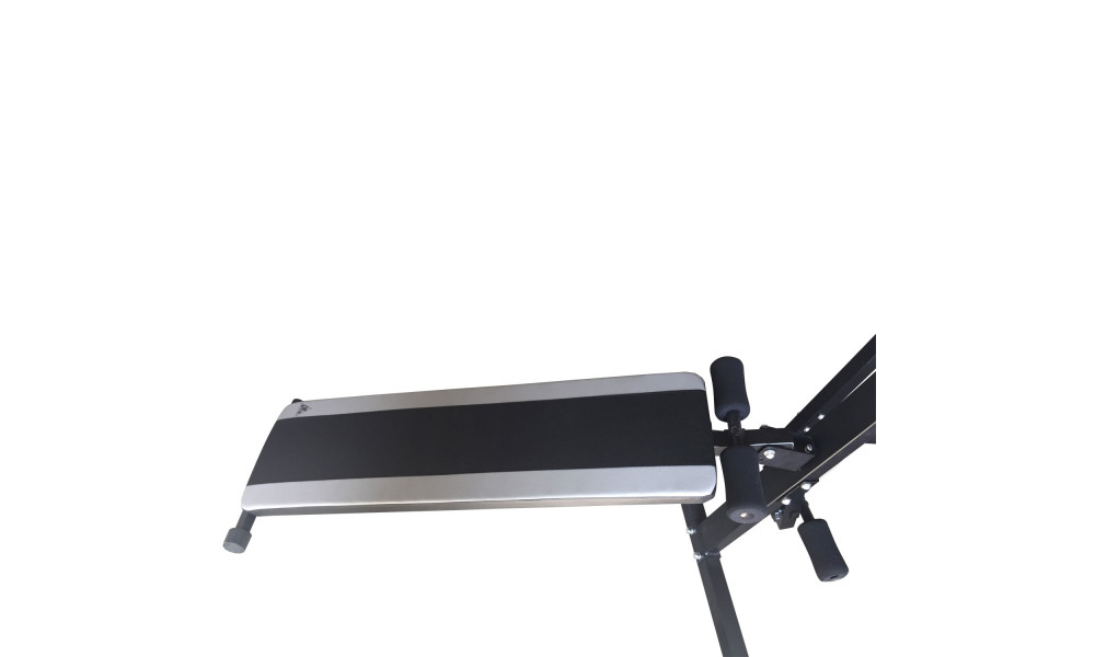 Прямая скамья в комплекте с удобными валиками предназначена для укрепления мышц спины и пресса.